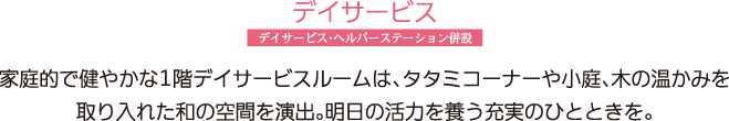 デイサービス・サービス付き高齢者向け住宅 24時間スタッフ常駐 安心してお過ごしいただけます。 |
